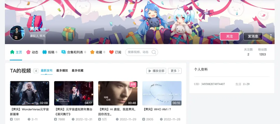 然而粉丝们却似乎并不太买账。在B站,“霁风”只有1353个粉丝,视频播放量也平平。由于缺乏真人般的互动和情感连接,也未和本人形成差异化,很多粉丝对偶像的数字分身反应冷淡。