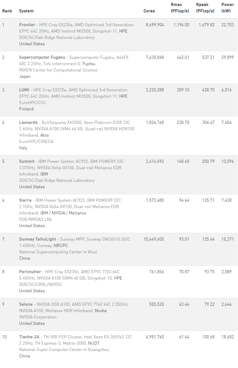 Fontier大家应该都比较熟悉了,去年6月曾以50%的性能优势取代日本“Fugaku”,成为世界第一超算,其性能甚至超过了当时第二名到第七名的总和。