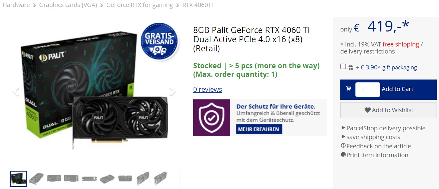 据3DCenter,目前市面上最便宜的RTX 4060 Ti售价为419欧元(Palit Dual非超频型号)。尽管发售时有20欧元的折扣,但GeForce RTX 4060 Ti的销量远低于预期。
