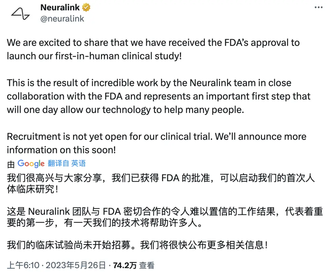 马斯克的脑机接口公司Neuralink周四表示,已获得美国食品和药品管理局(FDA)批准,将启动首次脑植入物人体临床研究。Neuralink在一条推文中表示:“这是Neuralink团队与FDA密切合作的令人难以置信的工作成果,代表着重要的第一步,有一天我们的技术将帮助许多人。”
