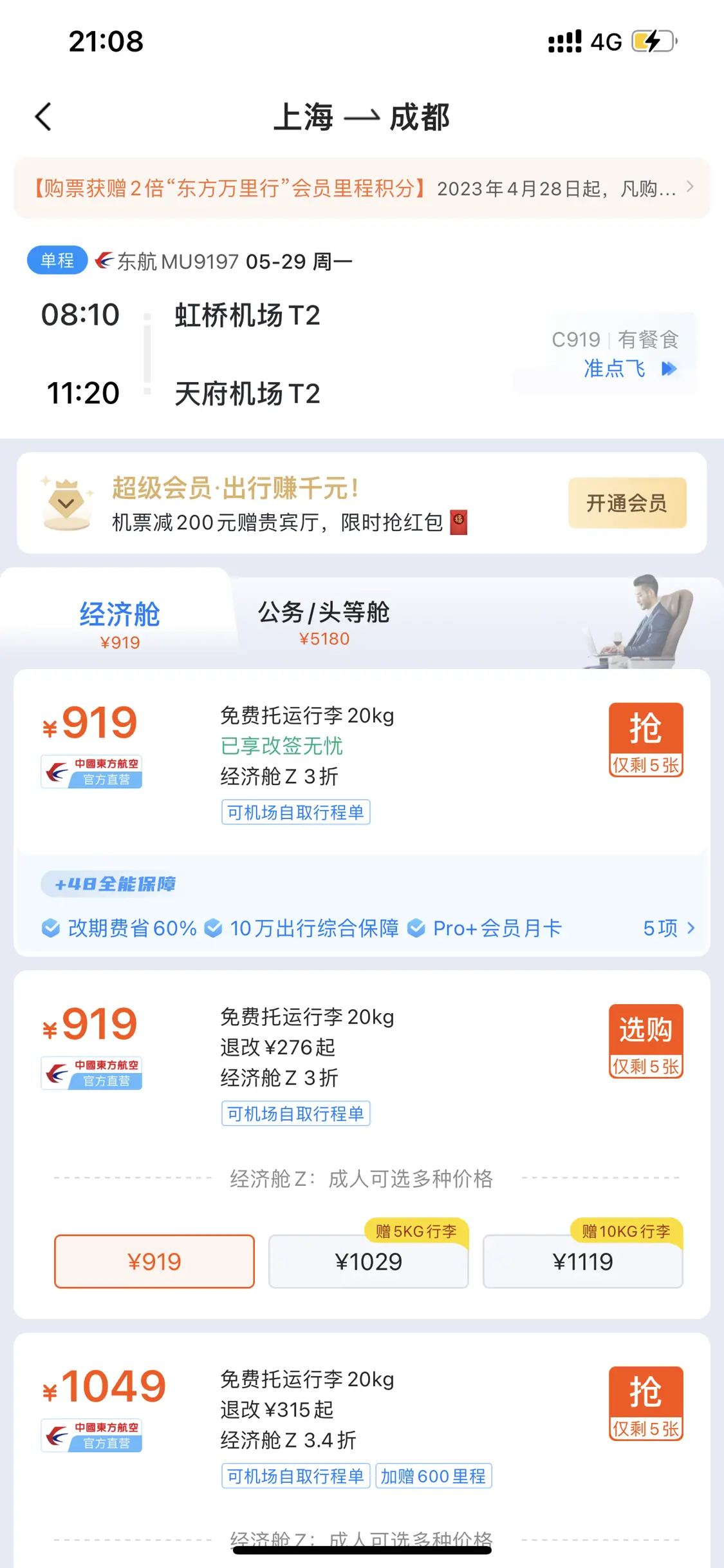 财联社记者从飞常准处获悉,当前已可购买C919客运航班机票。非常准相关负责人表示,这是C919首个全面开售的商业航班。可购买航线为上海虹桥-成都天府,经济舱不含税价格为919元。