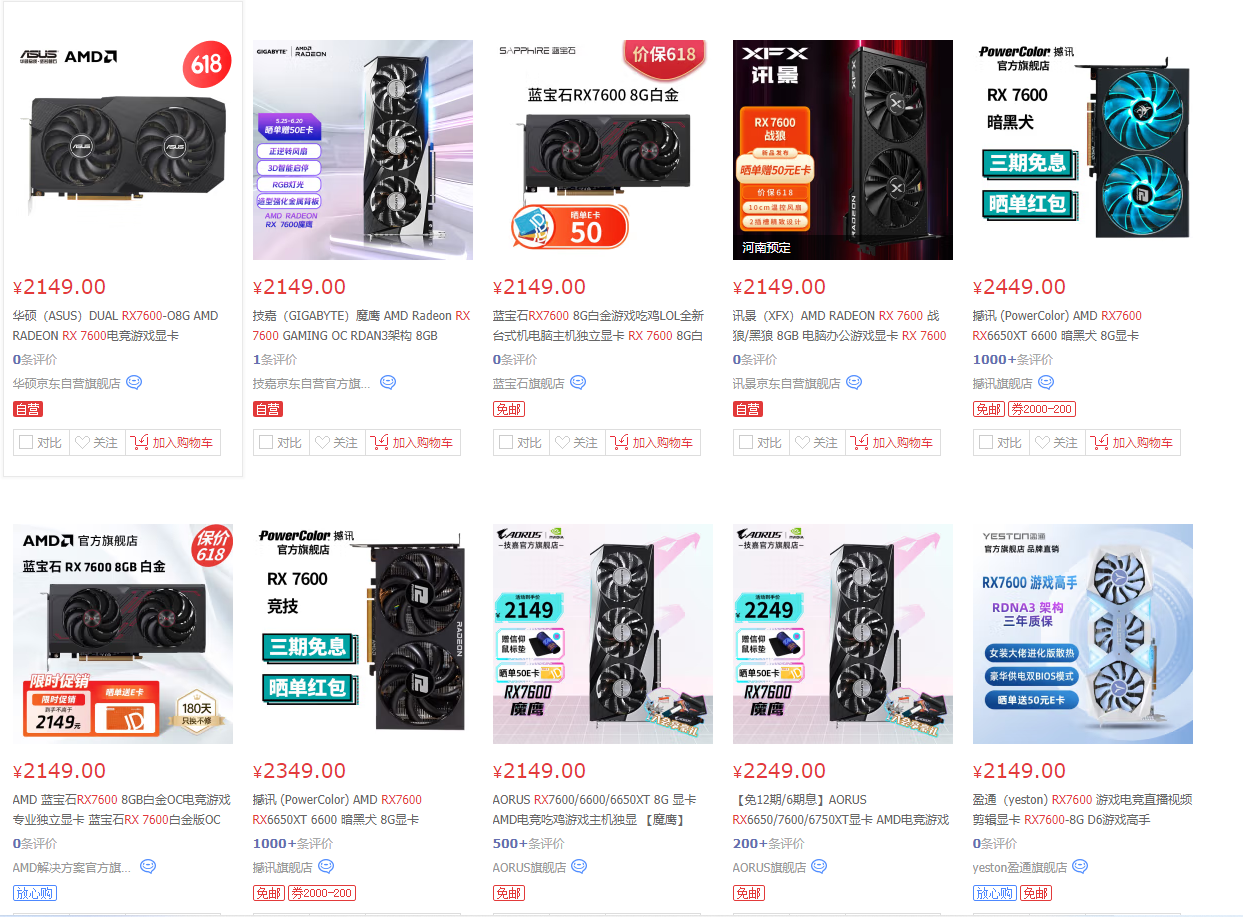 截稿前在国内市场,2149元的RX 7600还暂时稳定,不过不少厂商都同步推出晒单赠50元E卡的活动,等于到手2099元……