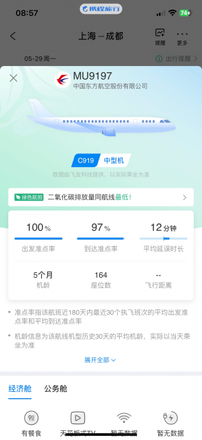 不过,这两趟航班并没有开发售票,而我们可以买到的C919首趟航班为5月29日MU9197航班,从上海虹桥机场飞往成都天府机场。