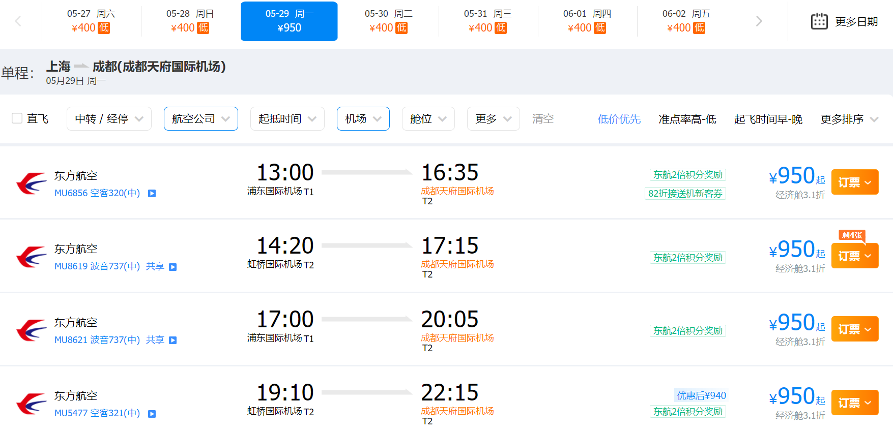 作为对比,查询了下东航5月29日上海到成都的其他机型票价,空客及波音机型的经济舱价格是950起,可见国产C919航班还是有点优惠的,不知道后续价格是否维持在919元价位。