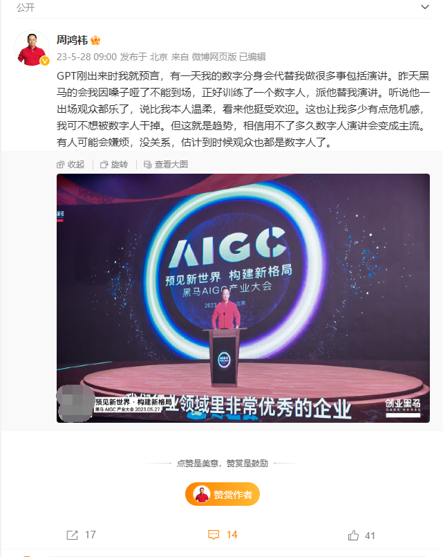 值得一提的是,周鸿祎在GPT刚发布时就预言,有一天他的数字分身会代替他做很多事包括演讲。