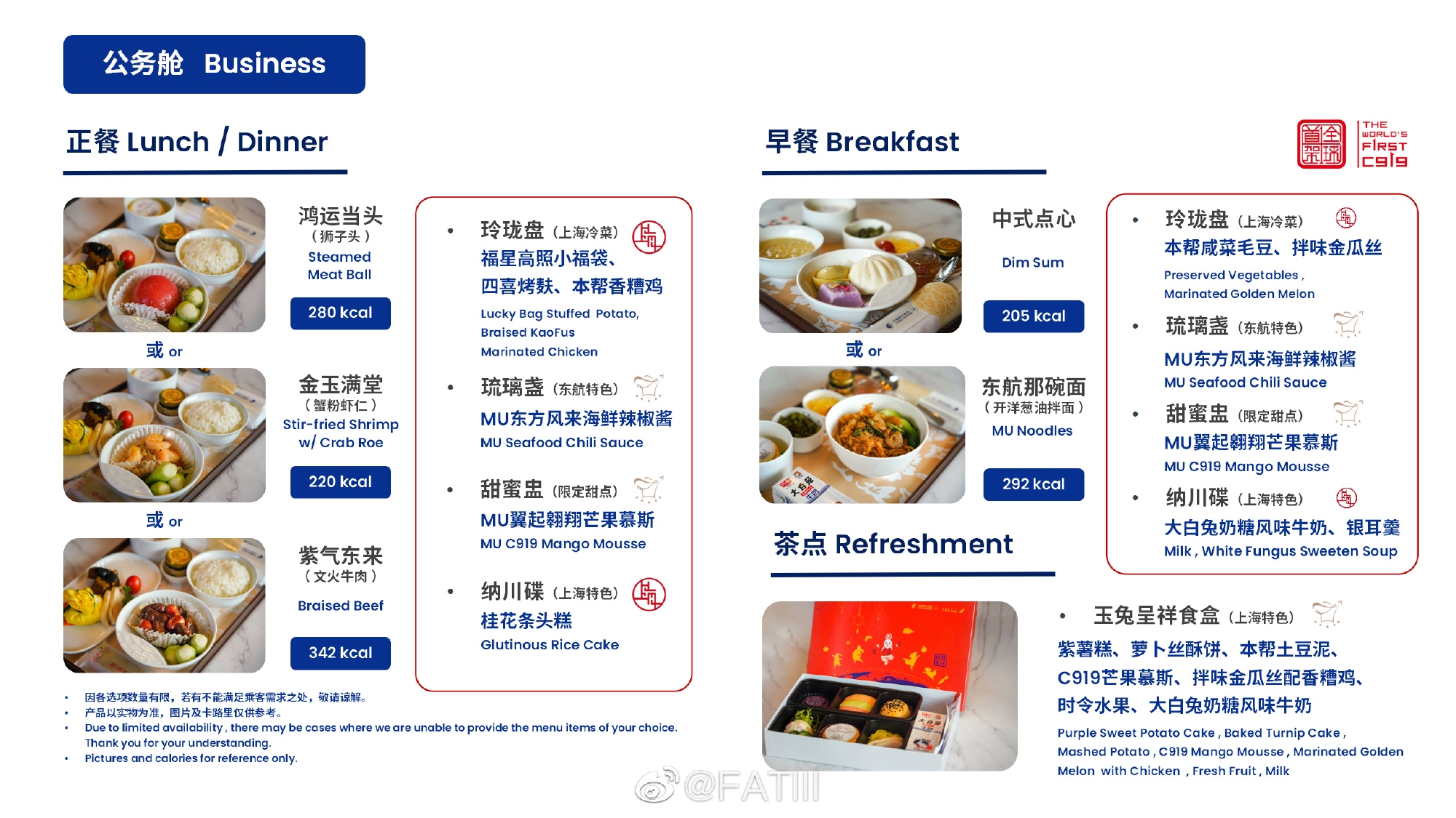 而公务舱的主题餐更为丰富,正餐分为“鸿运当头”、“金玉满堂”和“紫气东来”三种,对应的特色菜品分别为狮子头、蟹粉虾仁和文火牛肉,而早餐除了“东航那碗面”之外,还提供中式点心,至于茶点,则和普通舱类似,为“玉兔呈祥食盒”。