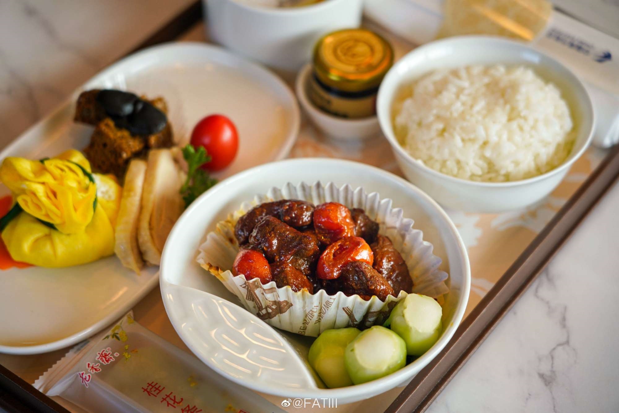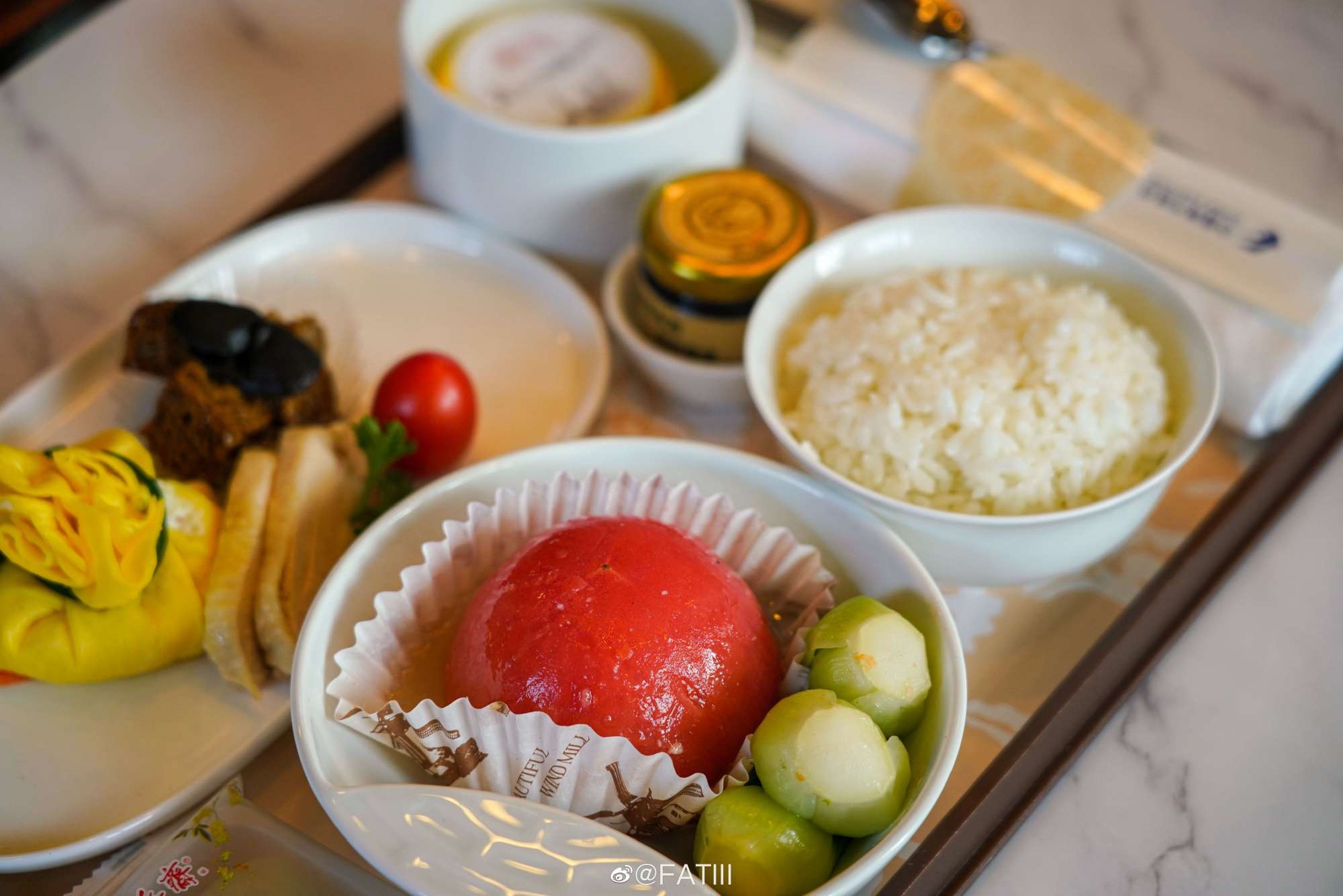 国产大飞机C919首次商业飞行已经圆满完成,平安落地北京首都机场,并接受了“水门”洗礼。值得一提的是,本次航班上将会有旅客投票选出的主题餐食亮相,其中,经济舱的这款午餐食叫“五福临门”,主食是腊味煲仔饭,搭配三色水果拼盘,C919首航特色芒果布丁,还有巧克力酥饼和上海特产大白兔牛奶。
