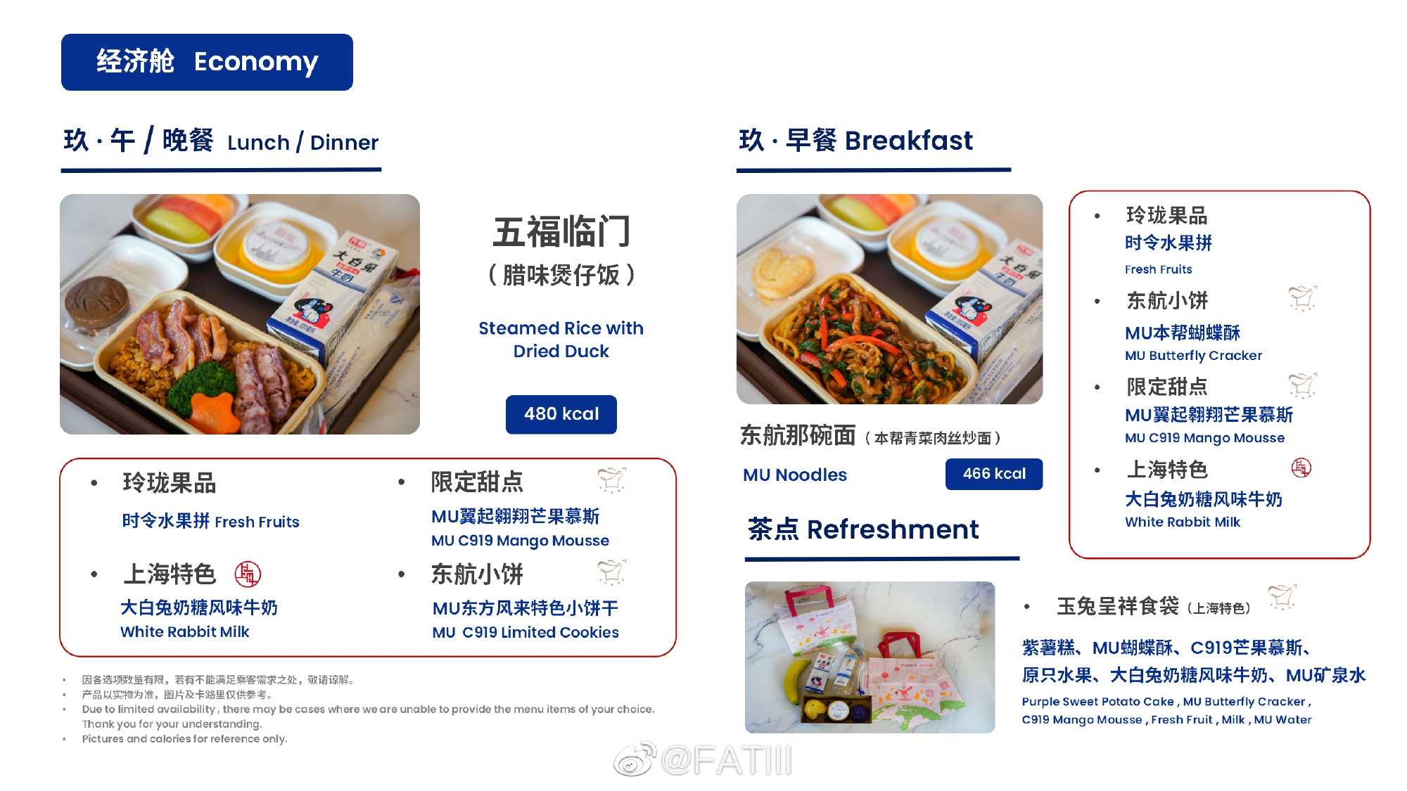 此外,C919航班还将提供早餐“东航那碗面”,包含玲珑果品(时令水果拼)、东航小饼、限定甜食和大白兔牛奶,同时还提供茶点“玉兔呈祥食袋”,内涵有紫薯糕、MU蝴蝶酥、C919芒果慕斯、矿泉水等。