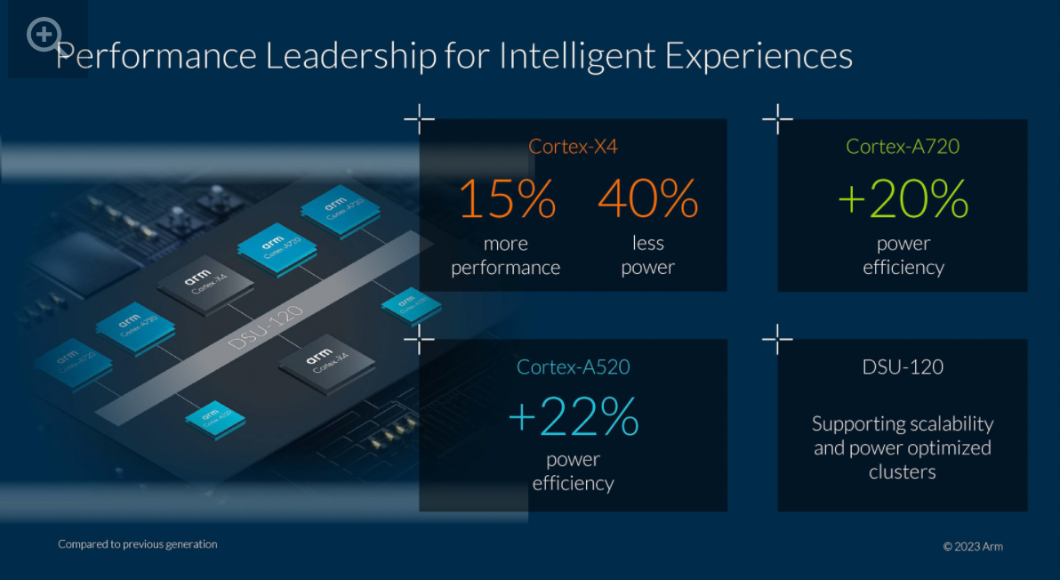 整个X4/A720/A520家族的特点就是性能提升同时能效更高,X4超大核能降低40%功耗让人狠期待,其他核心及DSU也有20%左右的能耗改善。