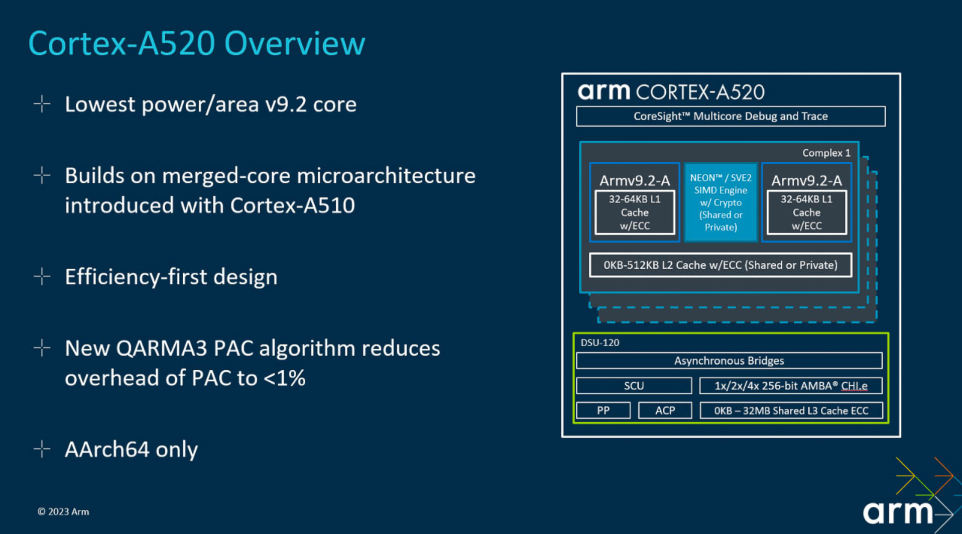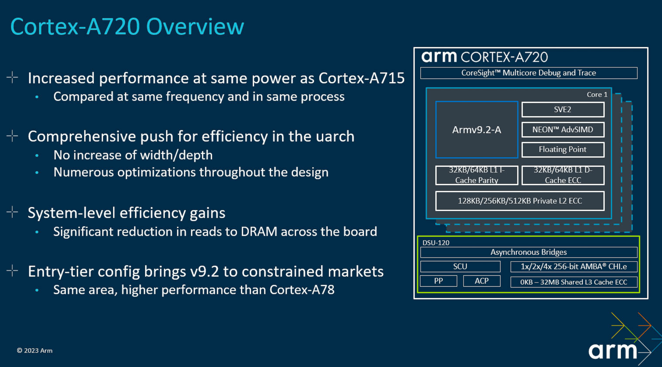 除了X4、A720等CPU架构之外,Arm这次也升级了DynamIQ 管理内核DSU-120,可以更好地提升CPU并行性,最高做到了14核CPU,显然是准备给Arm PC笔记本的。