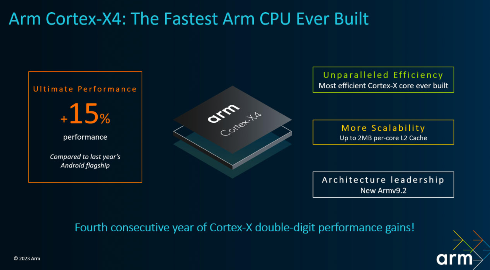 作为单核性能的主力,X4超大核是Arm架构中能效最好的,同时还提升了并行性,L2缓存可提升到每核2MB。