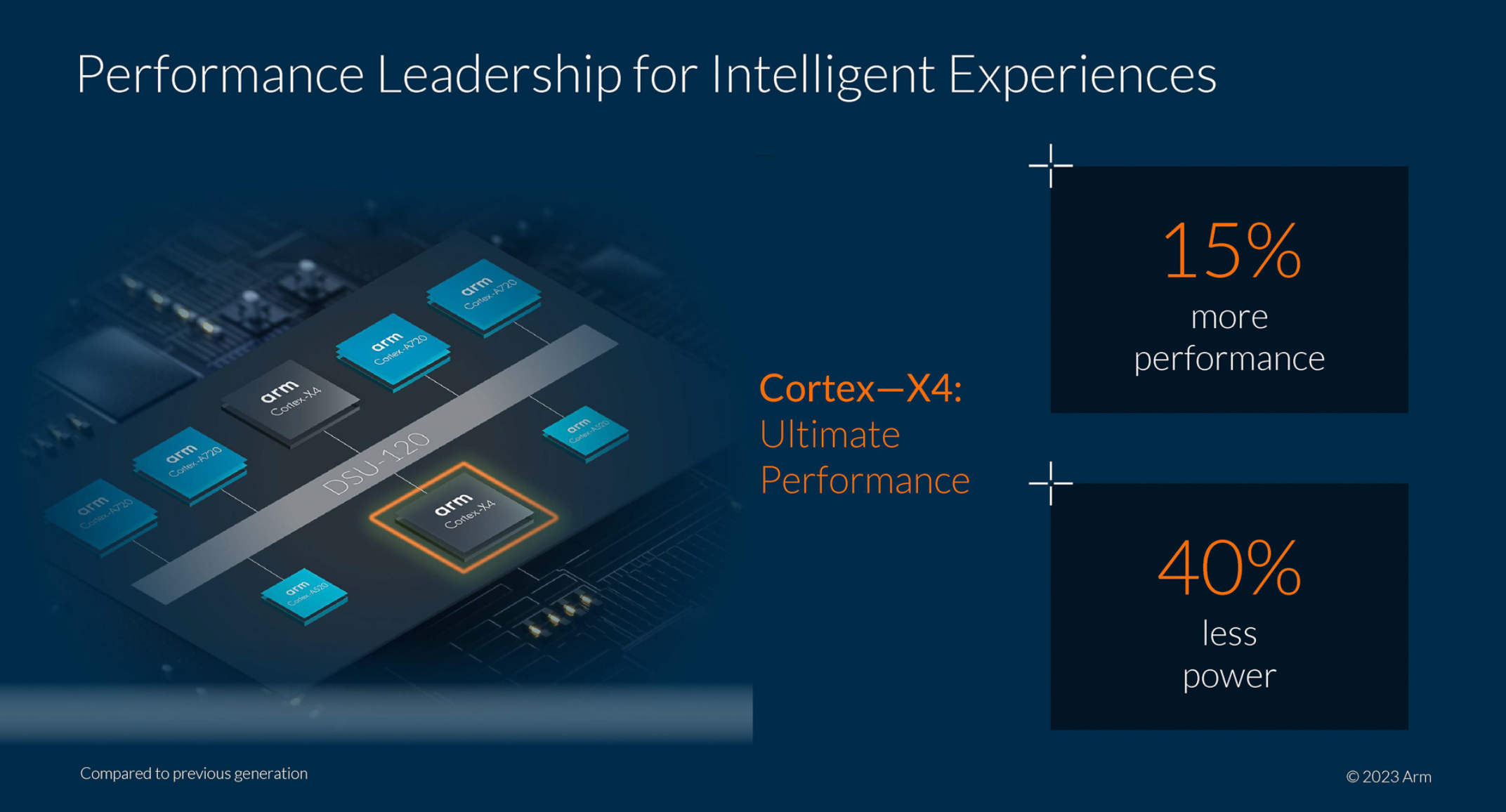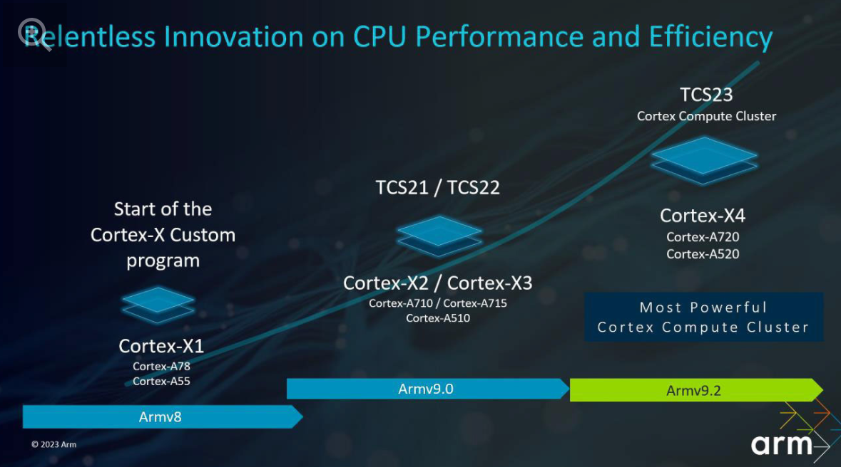 Arm今天又发布了全新一代Cortex移动CPU架构,包括Corte-X4超大核、大核A720及能效核A520,这一次不仅全面走向纯64位,淘汰32位架构,同时也做到了更高的性能,PC上有望实现10核X4+4核A720的搭配。本次发布的X4/A720/A520基于最新的Armv9.2指令集,相比上代的X2/X3基于Armv9.0主要提升了性能及并行性,可以支持更多的大核/超大核组合。