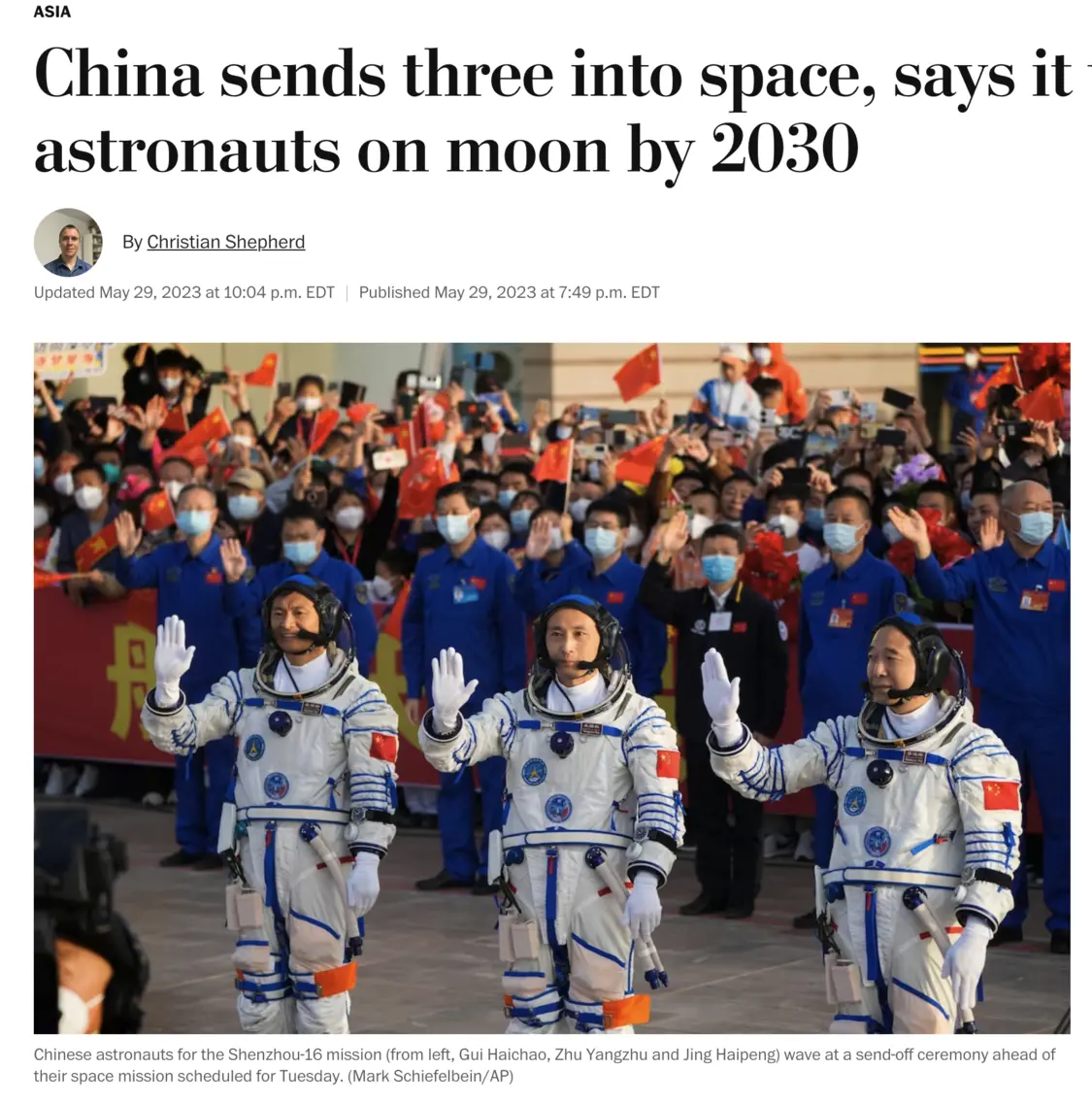 《华盛顿邮报》称,周二上午,中国又将三名宇航员送入太空,其中包括第一位平民宇航员。此前一天,中国宣布计划在2030年前将宇航员送上月球,建立了与美国竞争的新领域。