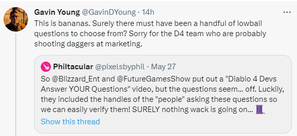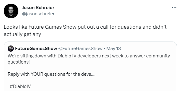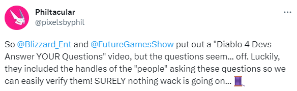 上周暴雪在《暗黑破坏神4》问答节目上,解答了一些玩家留言的问题。但由于提问比较平庸,官方回答也很无趣,导致不少玩家质疑暴雪在问答节目中作假。对此一些游戏业内人士展开了调查,发现这些提问题的社交账户要么不存在,要么是在视频发出后才提出的问题。