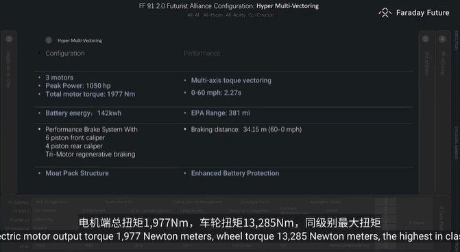 另外,FF 91拥有超过5米2的车长与3米2的轴距,三电机最大马力1050匹,零百加速仅需2.27秒。电池容量为142kWh,EPA续航可达381英里(约为613公里)。