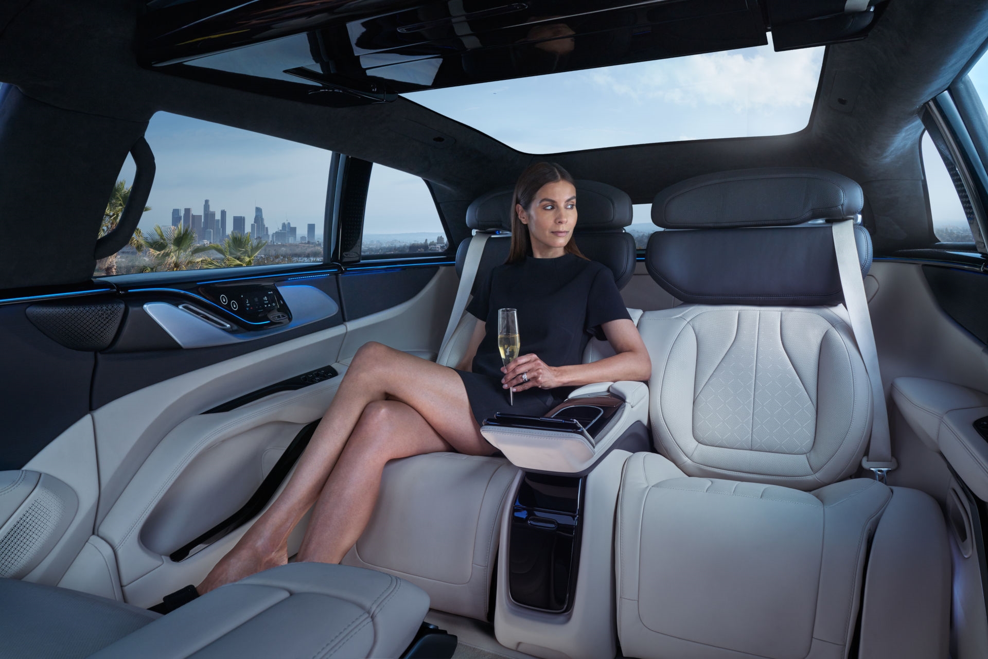 据其介绍,FF 91车内配备反重力座椅,后排可完全放倒休息,拥有加热、按摩功能、车顶配置PDLC玻璃,可主动调节透光度,内饰也极致奢华。