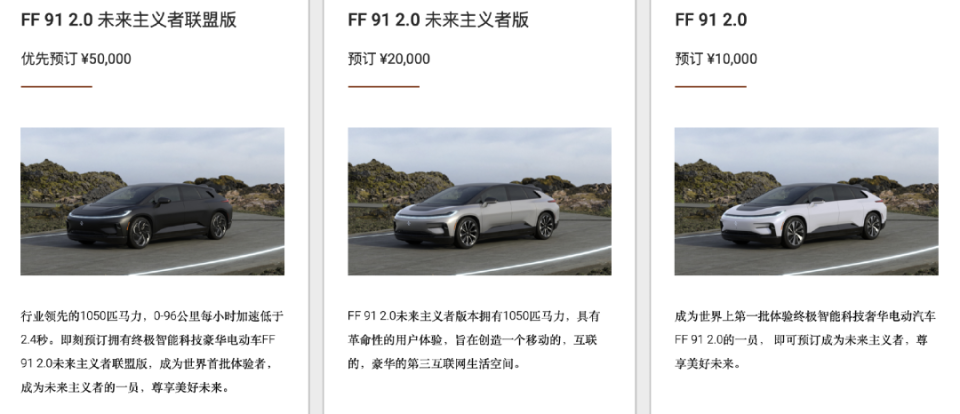 其中FF 91 2.0 未来主义者联盟版预订金额为5万,FF 91 2.0 未来主义者版和 FF 91 2.0 预订金额均为2万。