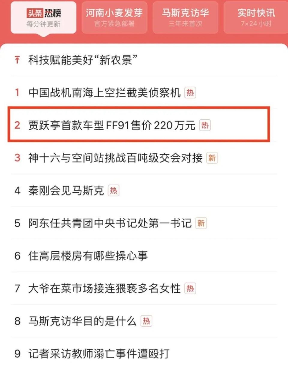 不过作为贾跃亭历时9年打造的新车,FF91的亮相仍然成为舆论焦点,关于贾跃亭和FF91发布会的话题,很快冲上抖音和微博的热搜榜,甚至超过了马斯克访华的话题热度。