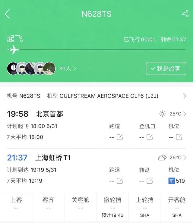 5月31日晚,据“飞常准”APP显示,19时58分,特斯拉CEO马斯克的私人飞机(注册号:N628TS)已经从北京首都机场起飞,前往上海虹桥机场,预计落地时间为21时37分。