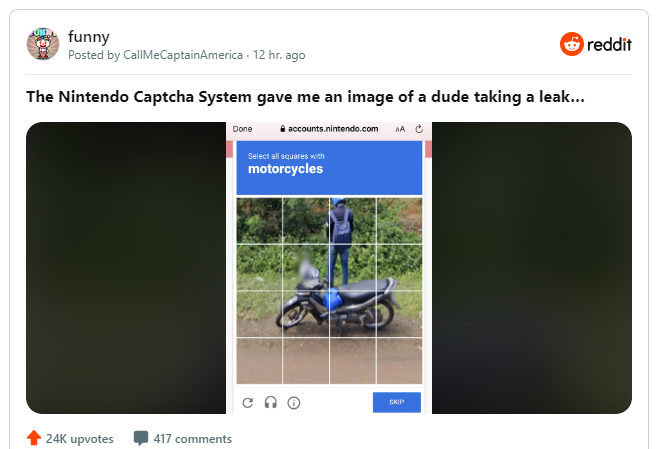 ·这套认证系统是来自谷歌的reCAPTCHA,谈不上好用吧,不过经常耽误网友时间倒是真的,近日Reddit网友就分享了自己在登陆任天堂账号时弹出的认证图片,忍不住笑了起来,不知道哪一年,当你在路边放出久续之小便,浑身通畅爽快之时,你怎能想到已经被拍了下来,成为众多认证图片库中的一员了。
