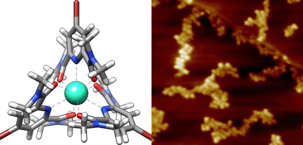 上图:左图-铽超分子组装示意图,铽为青色,溴为蓝色,氧为红色。左图-铽超分子组装的SX-STM图像。