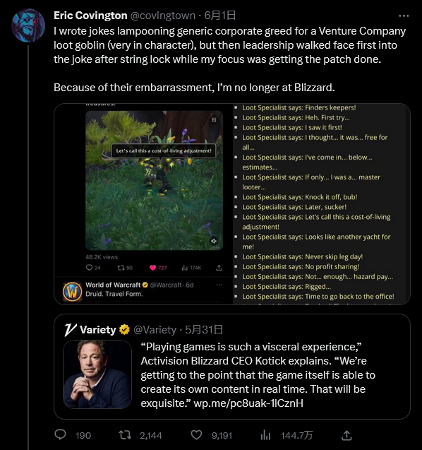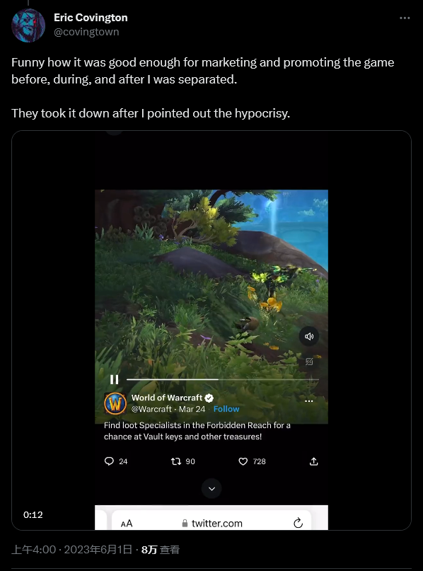 在推文后续中,他还表示这些带有讽刺幽默的台词曾经被《魔兽世界》官方用来进行宣传,但在他指出自己被开就是因为这些台词,这么做非常虚伪之后,官方下架了相关的宣传广告。