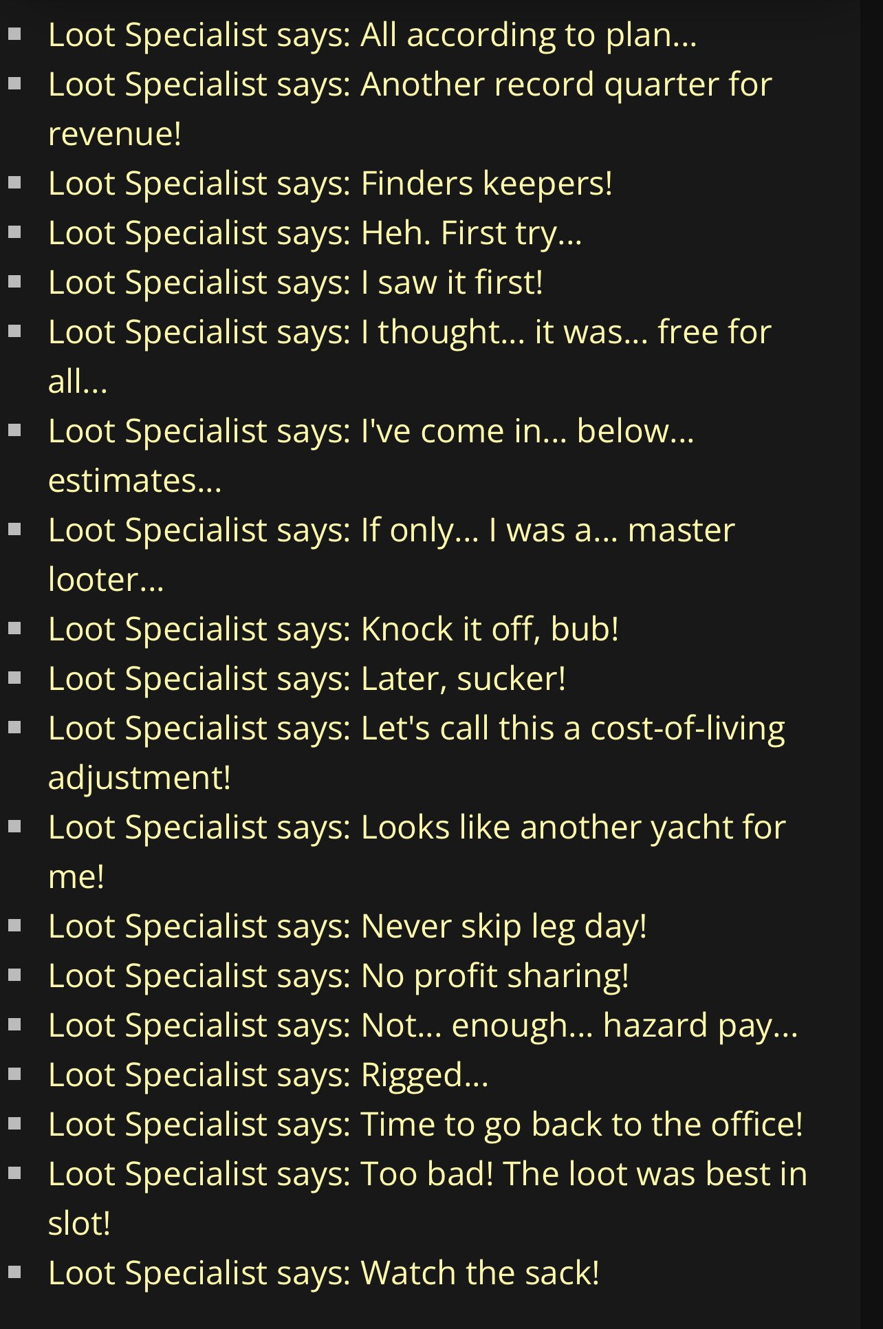 转发《综艺》的文章后,他展示了自己曾经为《魔兽世界》中负责的一系列台词。这些台词属于角色风险投资公司的搜刮地精。据 Eric 解释,他写了“一些常见的讽刺企业常见的贪婪行为的笑话”,并且认为这些台词非常符合这些地精贪婪的角色。然而因为“某位高层”在玩游戏时看到这些台词,并感到自己被嘲讽,不仅要求删除了部分台词,还将他开除。
