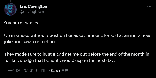 Eric 表示,自己在暴雪干了整整 9 年:“9 年的一切付出,就因为有人在无伤大雅的笑话中看到自己的倒影,全部都化为泡影。”不仅如此,这些人为了不让他拿到员工拥有的福利,想尽一切办法将他在月底前开除。