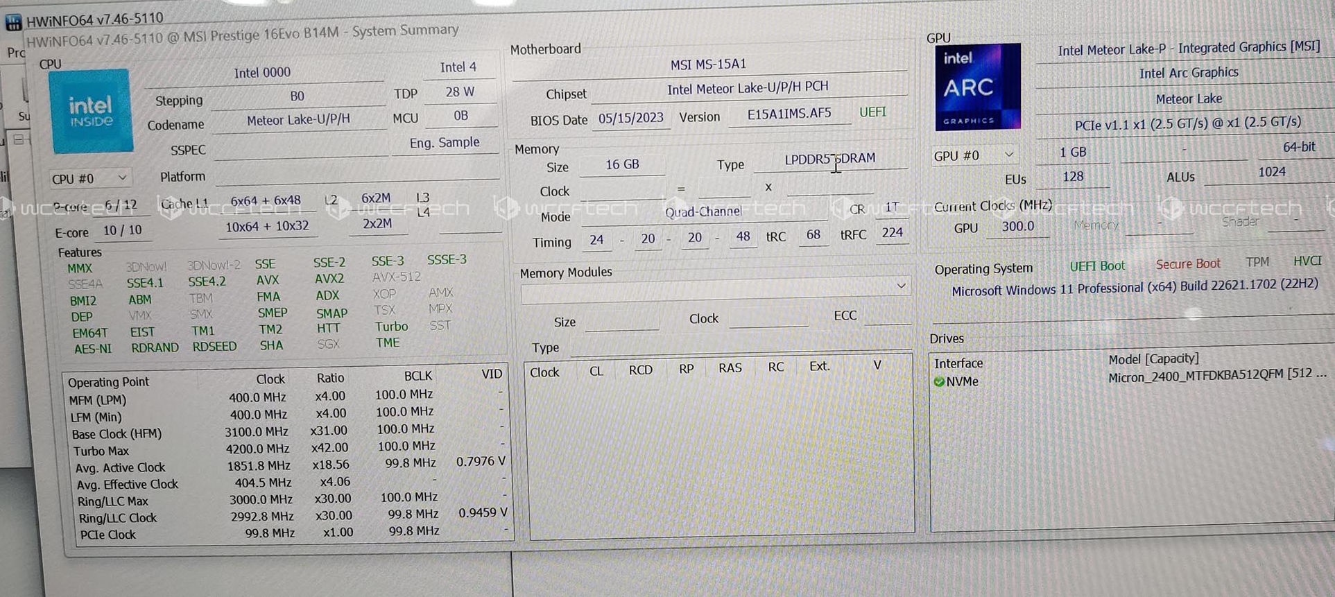 Intel在台北电脑展上展示了Meteor Lake(可能叫14代酷睿)所集成NPU AI单元的能力,微星则第一家摆出了搭载新平台的笔记本。WCCFTech偷偷安装了检测跑分软件,确认新处理器有6个大核、8个小核、2个超小核,其中只有大核支持超线程,因此总计22个线程,缓存则有一级1.6MB、二级18MB、三级24MB。