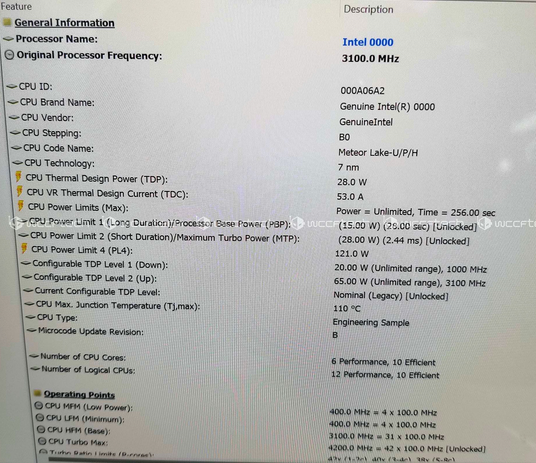 代号检测为Meteor Lake-U/P/H,但应该是P系列,因为标准热设计功耗设定在28W,最低可调至15W,最高可调至65W,PL4甚至可达不可思议的121W,当然就算能达到也只是一瞬间的事儿。