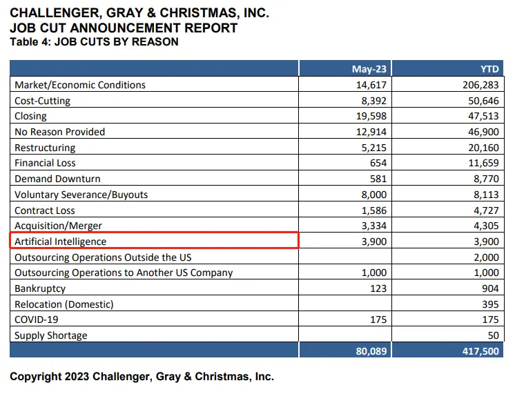 虽然报告展现的就业恶化趋势令人吃惊,但更为引人注目的一点是,挑战者公司首次在裁员原因的表格中列入了“人工智能”(AI),并表示美国企业约有3900个工作岗位被这项新兴技术所取代。