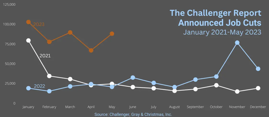 数据还显示,今年1月到5月,美国企业累计裁员了417,500人,较去年同期的100,694人增加了315%,为2020年以来的最高水平。如果不计入这个新冠疫情爆发的头一年,今年头五个月的裁员人数将是2009年以来的最高值。