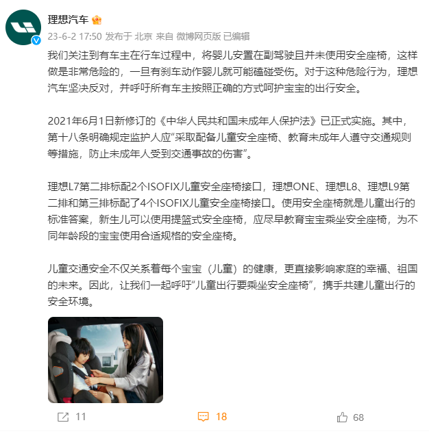 理想汽车呼吁,“儿童出行要乘坐安全座椅”,儿童交通安全不仅关系着每个宝宝(儿童)的健康,更直接影响家庭的幸福、祖国的未来。