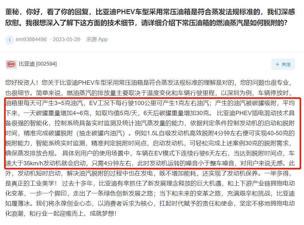 一开始,整个舆论环境也都是这么想的。但比亚迪在事情发生后的第三天,就在回答投资人问题时说到,自家的车型其实是有相应的技术,专门解决常压油箱里汽油蒸汽过多的问题的。