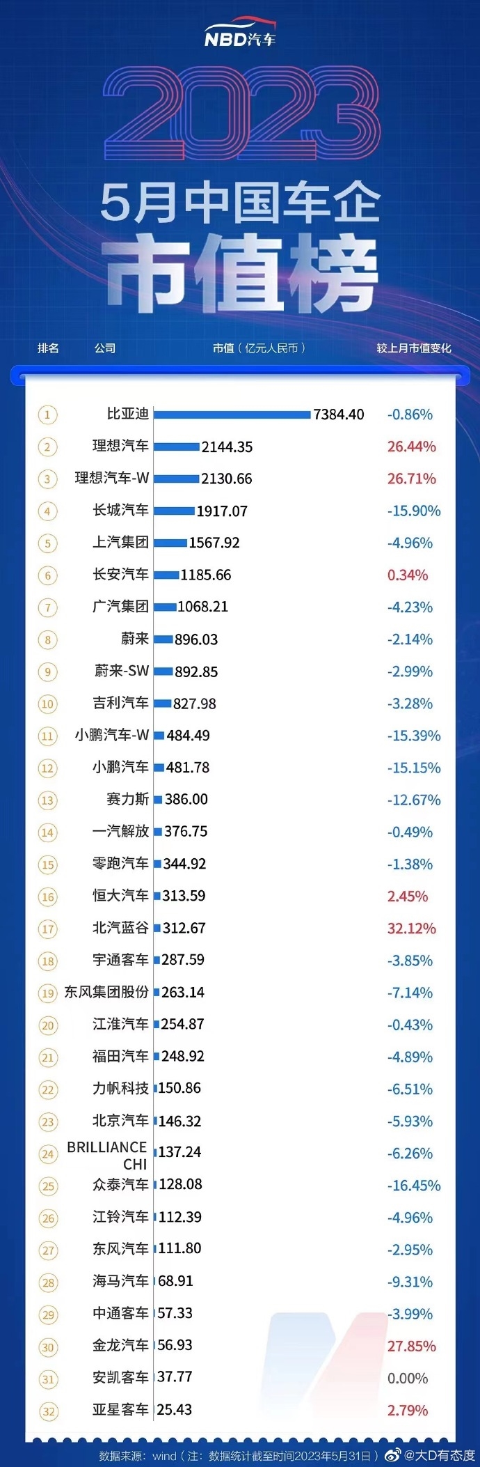 NBD汽车近日统计了5月中国车企市值榜单,其中比亚迪以7384.4亿元的市值排名第一,遥遥领先。理想汽车超越长城汽车排名第二。日前,有博主分享了这一数据,理想汽车CEO随后转发。