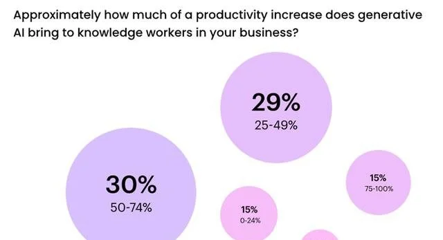其中,85%的受访者表示,生成式AI可将生产力提高至少25%;56%的受访者表示将提高至少50%或更多;约26%的受访者认为,将提高75%或更多。