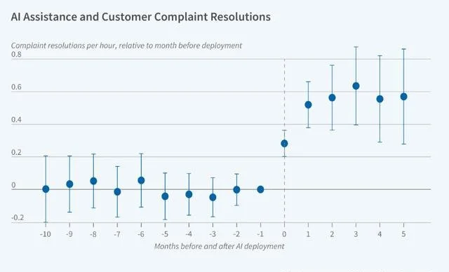 报告中的衡量标准为客服每小时能够解决的客户问题数量,结果显示,在将生成式AI融入到工作后,客服每小时解决的客户问题数量增加了13.8%。