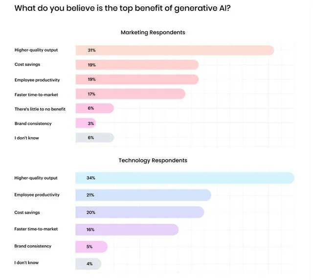 调查指出,在提升产出质量方面,市场营销和技术行业成为最大受益者。这主要是因为这两个行业应用ChatGPT等生成式AI的频率、属性契合度、应用范围高于其他领域。