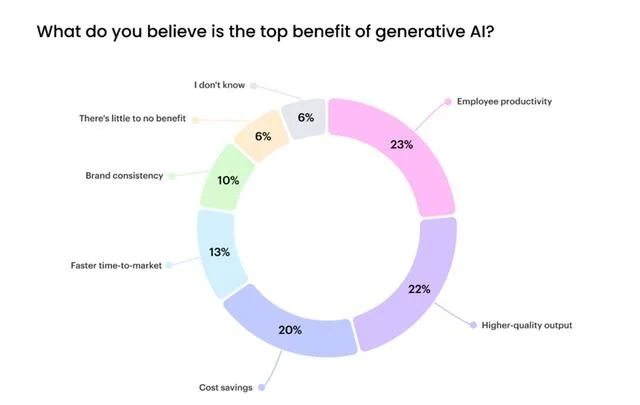 23%受访者表示,生成式AI最大优点就是提升生产力;22%表示,最大优点为更高的质量产出;20%表示,节约成本。只有6%的受访者表示,没有任何好处。