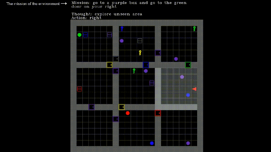 智能体可以拿起、放下、移动物体或者开门和关门,而锁住的门只能用颜色匹配的钥匙打开。