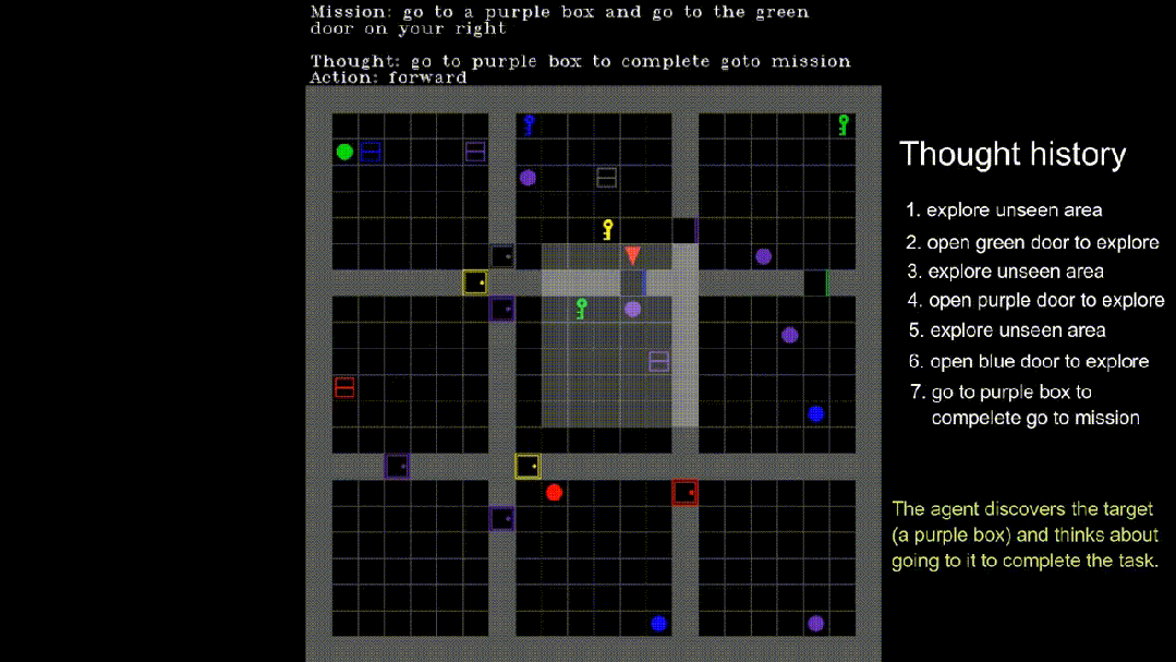 但是当它打开蓝色的门时,准备完成任务,却发现一个紫色的球挡住了去路。于是,思想克隆智能体再重新规划。