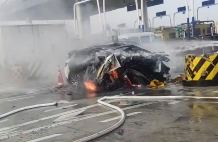 从现场的监控画面看,这台大众纯电SUV在即将经过收费站时,毫无减速,径直撞上了收费站的站台,撞击异常强烈,导致车辆解体,有碎片飞上了数米高空,不多时,车辆开始冒烟起火,火势非常猛烈。