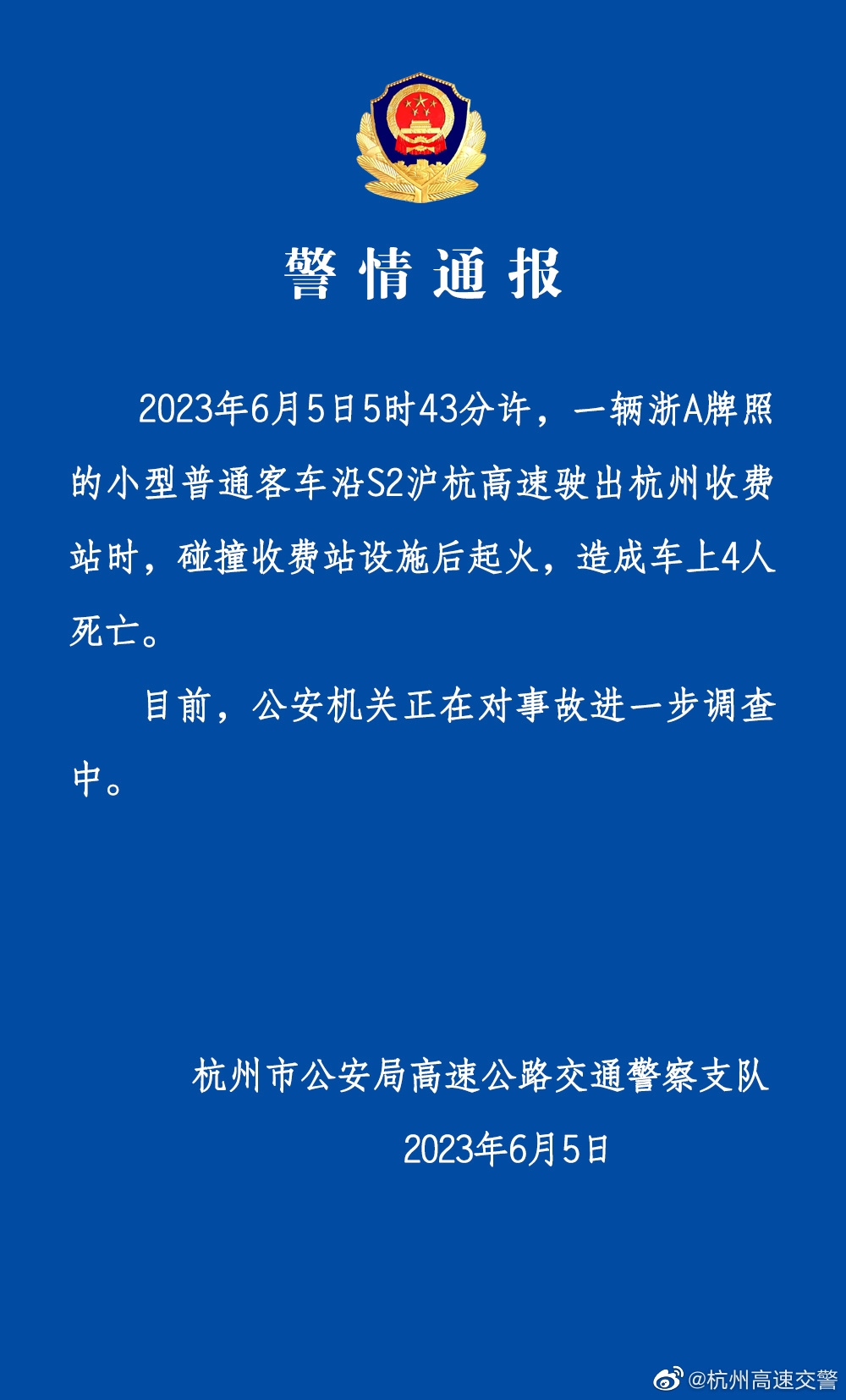 6月5日消息,据杭州市高速交警通报,2023年6月5日5时43分许,一辆浙A牌照的小型普通客车沿S2沪杭高速驶出杭州收费站时,碰撞收费站设施后起火,造成车上4人死亡。