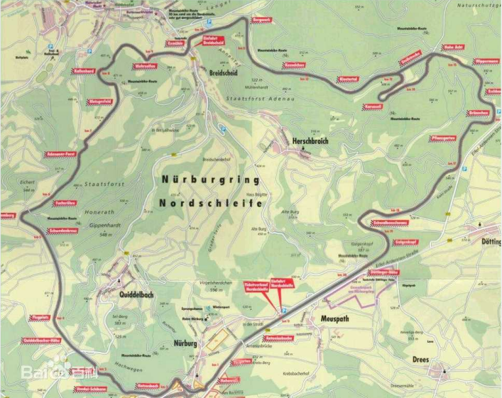 纽博格林北环赛道也简称纽北,总长度22.85公里,是世界上最长的赛道,而且赛道特性缓冲区很狭窄(容赛车犯错冲出赛道的区域),赛道随山而建,高低落差巨大,共有177处弯角,是一条难度极高的高速弯道,每年发生的事故都数不过来,所以也称之为“绿色地狱”。