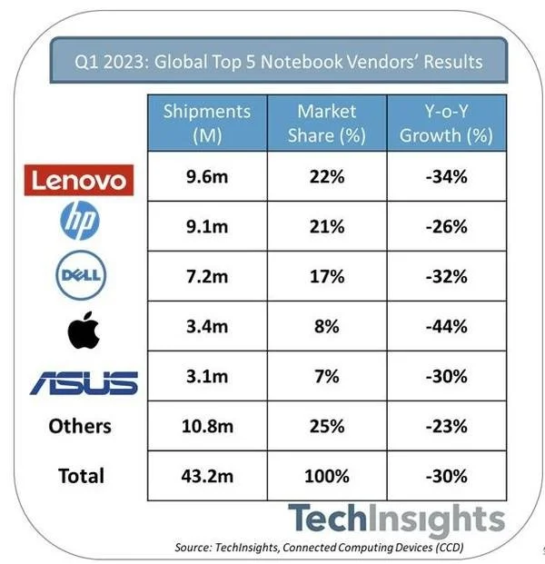 其实也不难理解,市场研究机构IDC称,在今年第一季度,全球个人电脑出货量暴跌29%,其中Mac系列的跌幅最大,出货量下滑44%,销售额下滑31%。归其原因还是,苹果去年推出的M2系列产品与三年前的M1差距不大,但在价格方面却相差近2000元。
