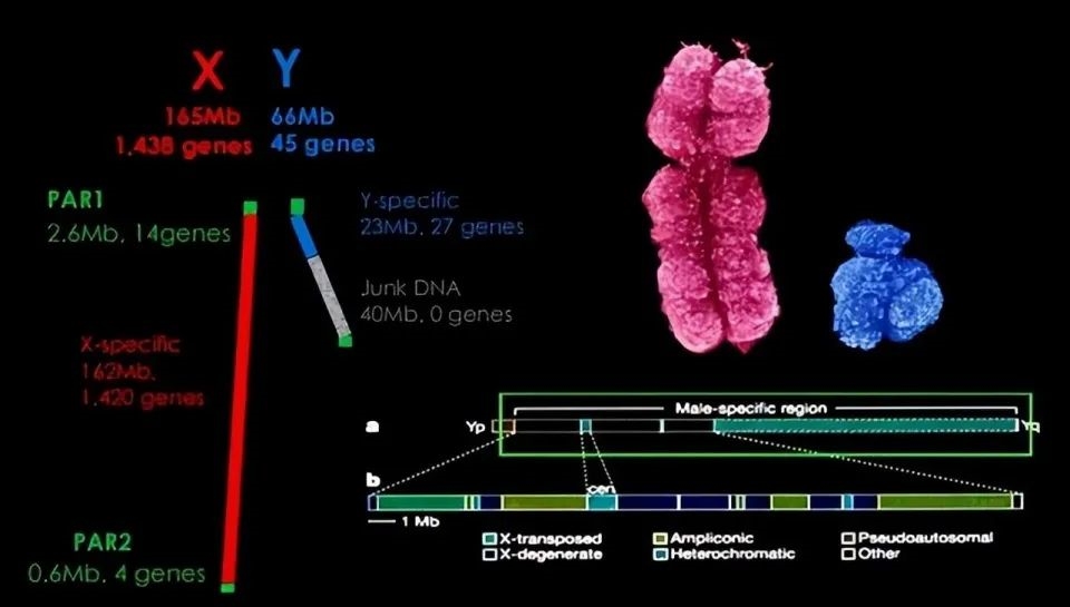 因为其同源染色体——X染色体拥有1000多个基因,而Y染色体实际上只有45个基因,以及大量的非编码DNA(一些简单重复没啥实际作用的 DNA)。