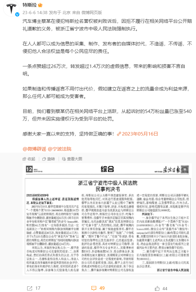 据特斯拉官方消息,汽车博主蔡某在侵犯特斯拉名誉权被判败诉后,因拒不履行在相关网络平台公开赔礼道歉的义务,被浙江省宁波市中级人民法院强制执行。特斯拉表示:在人人都可以成为信息的采集、制作、发布者的自媒体时代,不造谣,不传谣,不侵犯他人合法权益是每个公民应尽的责任。