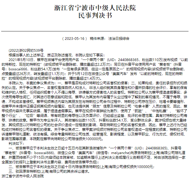 今年3月份,特斯拉控诉某音达人“蔡某某”名誉侵权一案,其二审判决结果为驳回上诉,维持原判,同时此判决为终审判决,“蔡某某”在判决生效之日起十五日内,在社交媒体上向特斯拉道歉,置顶持续不少于15日,并向特斯拉赔偿侵权损失10万元。