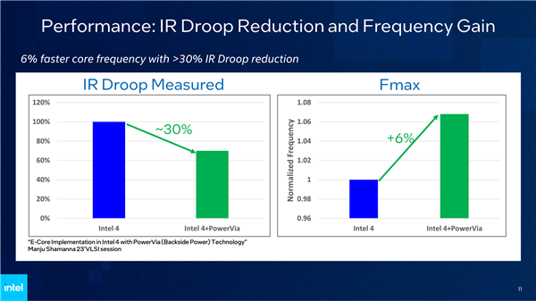 这两代工艺不仅会首次进入埃米级节点,同时还有两大黑科技——首发PowerVia背面供电、RibbonFET全环绕栅极两大全新技术,其中前者已经在Intel 4工艺上做了测试,将平台电压降低了30%,并带来了6%的频率增益。