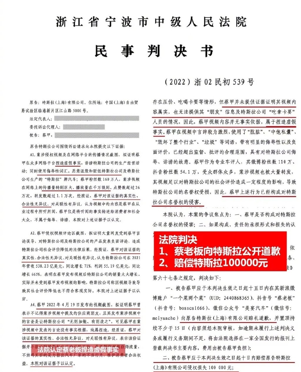 综合考量后,法院酌定蔡甲向特斯拉公司赔偿损失100000元。并要求蔡甲在社交平台向原告特斯拉(上海)有限公司赔礼道歉,并置顶持续不少于15日。